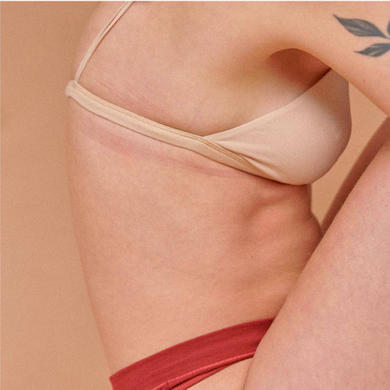 Panty tipo tanga, tiro alto, en algodón, fibra natural durable, biodegradable y fresca. Ayuda a que la vulva respire. Evita irritaciones y malos olores. Top sin varillas con doble elástico para sostener. 93% algodón y 7% lycra.