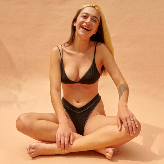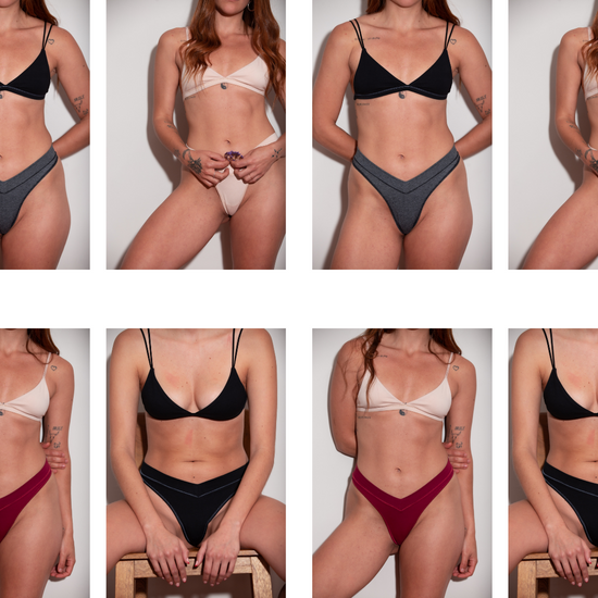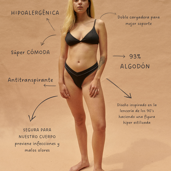 Panty tipo tanga, tiro alto, en algodón, fibra natural durable, biodegradable y fresca. Ayuda a que la vulva respire. Evita irritaciones y malos olores. Top sin varillas con doble elástico para sostener. 93% algodón y 7% lycra.